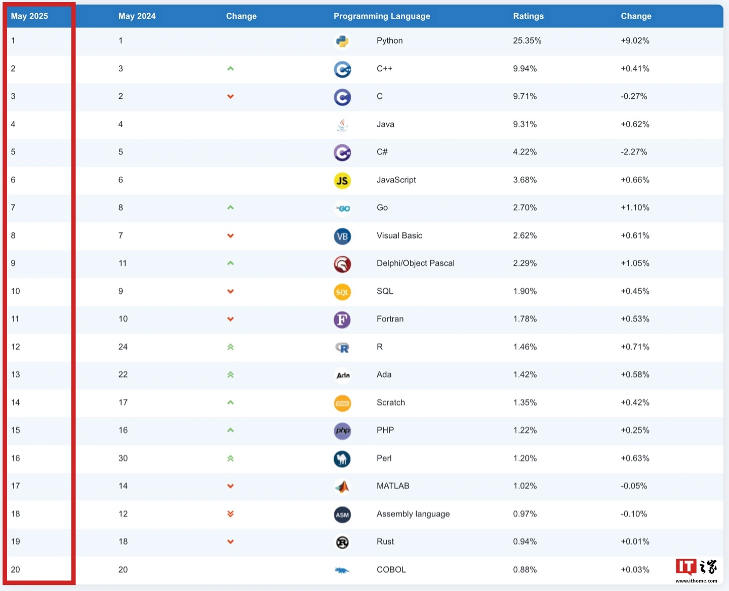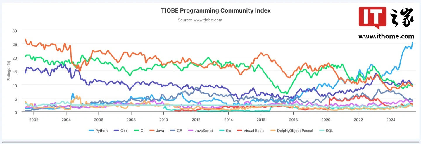 IT之家 5 月 9 日消息,TIOBE 编程社区指数是一个衡量编程语言受欢迎程度的指标,评判的依据来自世界范围内的工程师、课程、供应商及搜索引擎,今天 TIOBE 官网公布了 2025 年 5 月的编程语言排行榜,IT之家整理如下:
